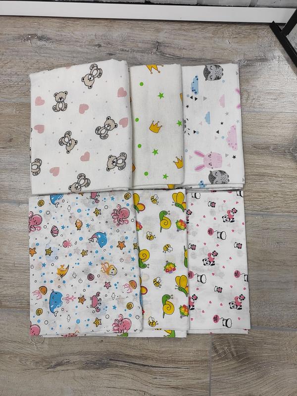 в наборе 6шт. 3 байковые пелёнки- 75*90 см. 100%байка(хлопок) 3 ситцевые пеленки 75*95 см. 100% хлопок уточняйте наличие расцветок, спрашивайте фото.
