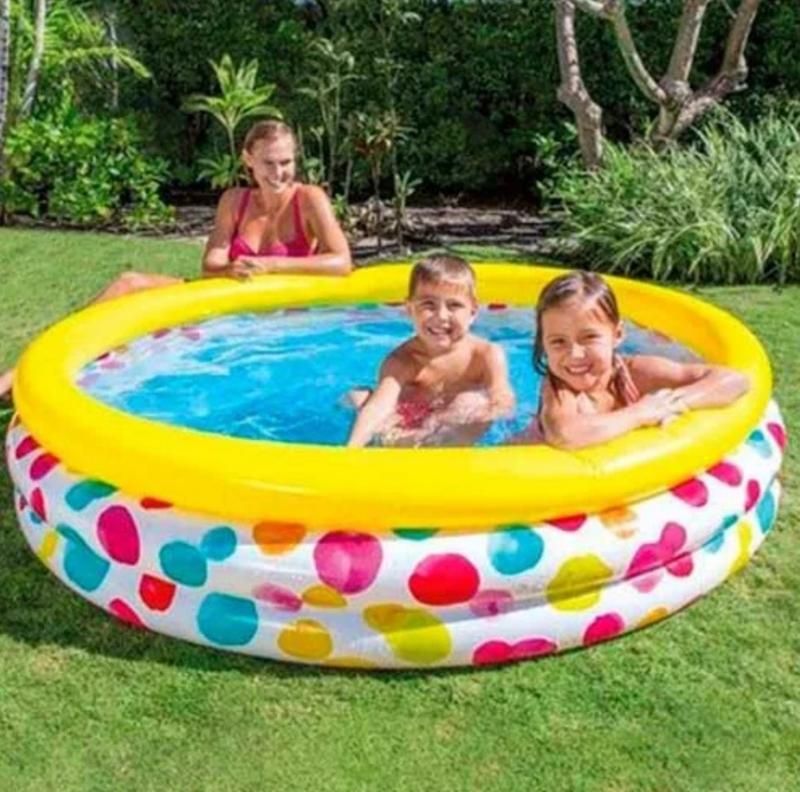 ОПИСАНИЕ ТОВАРА Детский надувной бассейн 59416 NP «Геометрия» от известной торговой марки Intex – идеальный вариант для жарких летних деньков. Если у вас есть загородный дом, или вы планируете отдых на побережье – тогда эта надувная игрушка станет спасением от летнего зноя и веселой забавой для ваших малышей. Детский бассейн выполнен в ярких цветах с симпатичным геометрическим рисунком, поэтому точно придется по вкусу вашим деткам. Каждый из 3-х самостоятельных отсеков бассейна снабжен отдельным клапаном. Объем вмещаемой воды составляет 581литр – а этого, более, чем достаточно для быстрого нагрева и веселой игры малышей от 3-х лет. Несмотря на то, что бассейн детский, не стоит оставлять маленьких деток без присмотра. Толщина стенок изделия – 0,23 мм, толщина дна – 0,18 мм.