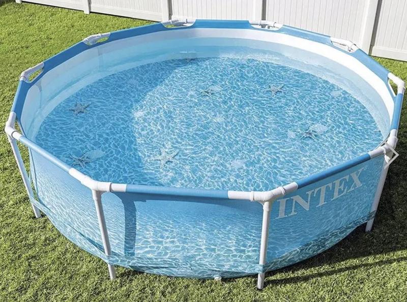 Каркасный бассейн Intex Привлекательный круглый бассейн интекс гармонирующего с водой синего цвета стал популярен в классе средних бассейнов. Он быстро монтируется. Каркас состоит из крепких труб с цинковым покрытием, защищенных от окисления. Для установки требуется чистая горизонтальная зона. Чаша бассейна изготовлена из ПВХ, сделанного по специальной технологии сплавления слоя стекловолоконной сетки и 2 слоя поливинилхлорида. Такой материал характеризуется достаточно большой прочностью и очень долговечен. Днище бассейна снабжено сливным клапаном, к которому легко подсоединить шланг и слить воду в нужное место. Характеристики: Диаметр – 305 см Высота – 76 см Размеры – Диаметр 305 x Высота 76 см Вес – 19,7 кг. Каркас – оцинкованные стальные трубы. Материал – трехслойный ПВХ: два слоя ПВХ и слой стекловолоконной сетки Объем воды – 4485 л. Производитель — Intex Размер упаковки – 35x30x88 см. Серия – Metal Frame Pool Сливной клапан — есть Страна-производитель. Упаковка-картонная — коробка. Форма – Круглый Цвет – морской принт