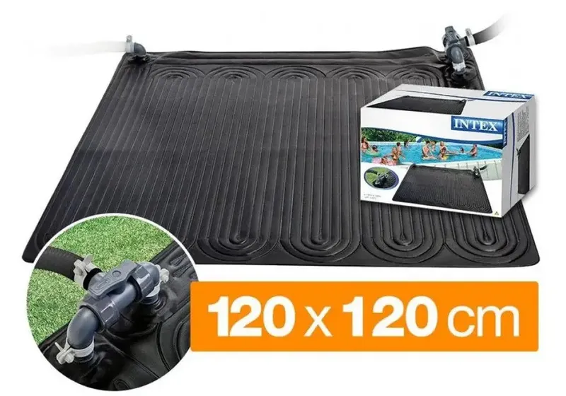 З приходом сонячних днів сонячний мат INTEX є екологічним та економним способом обігріву вашого басейну. Завдяки сонячним променям тепер ви зможете набрати кілька градусів і таким чином скупатися в підігрітій воді . Сонячні килимки мають з’єднувачі , за допомогою яких їх можна з’єднати. Ви можете встановити до 6 матів послідовно залежно від розміру вашого басейну. Екологічна технологія використання сонячної енергії підвищує температуру води в басейні приблизно на 3-5°С залежно від погодних умов. Підходить для наземних басейнів ємністю до 30280 л. Просте підключення. Сумісний із насосом зі швидкістю потоку менше 5678 л/год. Поверхня поглинання сонячних променів. Легко осушити, легко зберігати Розміри: 120 х 120 см (у не надутому вигляді) Виготовлений із надміцного стійкого до УФ матеріалу ПВХ. До комплекту входить: Місця для підключення 32мм шланга 1 перехідник А і 1 перехідник для сполучного шланга 38мм 0.5м сполучний шланг (діаметр 32мм) Обвідний клапан Фільтр-насос, л/год Кількість матів, шт. 1250 л/г 1-2 шт 2006 л/г 2-4 шт 3785 л/г 3-5 шт 5678 л/г 4-6 шт літрів в басейні, мін/макс кількість матів, шт. 880-3853 л 1 шт 5621-7127 л 2 шт 8592-13365 л 3 шт 12706-13365 л 4 шт 16805л-17203 л 5 шт 24311 л 6 шт Сонячний нагрівач води підходить для басейнів об'ємом до 30280 літрів. Розмір килимка: 120х120 см