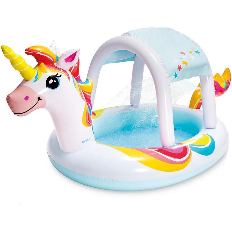 Детский надувной бассейн Единорог с навесом и фонтанчиком. В завитках его расписного хвоста спрятан разбрызгиватель, который выдает бодрящий фонтан брызг при подключении к садовому шлангу, а на упругих боках крепится навес, спасет малышей от жарких солнечных объятий. Надувной детский бассейн для дачи станет ребятне отличным развлечением на все лето, а вам гарантирует неоценимые минуты покоя, которым вы будете наслаждаться, покуда чадо увлеченно плещется в воде. Характеристики: Размер: 254 * 132 * 109 см; высота бортиков 18 см. Объем: 130 литров при наполнении на 80%. Материал: винил, толщина 0.30 мм. Дно не надувное. Удобный сливной клапан. Фонтанчик, расположенный в хвосте, подключается к садовому шлангу. Размер коробки 38 * 11 * 32 см.