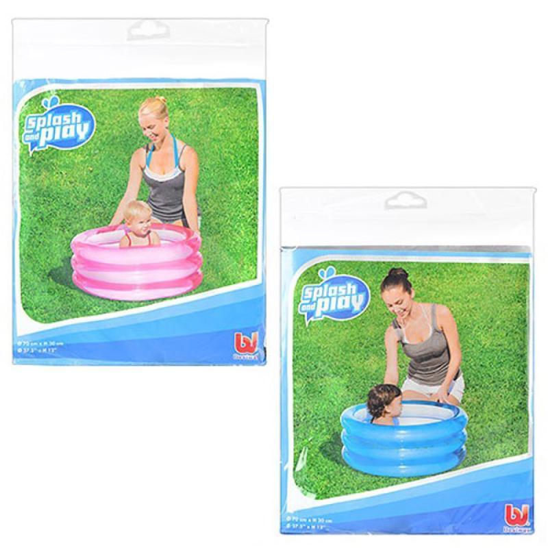 Дитячий надувний басейн Bestway, 2 кольори. 3 надувних кільця. Ремкомплект в наборі. Форма - коло. Розмір в розгорнутому вигляді - 70 х 30 см. Об'єм - 48 літрів. Матеріал - ПВХ. Упаковка - коробка.