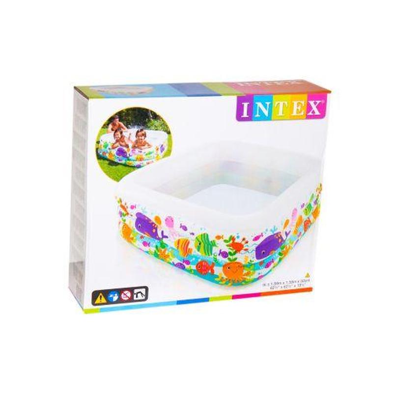 Басейн надувний "Акваріум". Виготовлений з високоякісного вінілу, товщина - 0,30 мм. Обсяг - 424 л. Бренд: Intex Упаковка: Коробка Колір: Блакитний Тип ел-тів живлення: Немає Ел-ти живлення в комплекті: Ні Вага з упаковкою: 3800 г Габарити в упаковці: 10 x 31 x 36 см Габарити без упаковки: 50 x 159 x 159 см Країна виробник: Китай Матеріал: Вініл Комплектація: Басейн