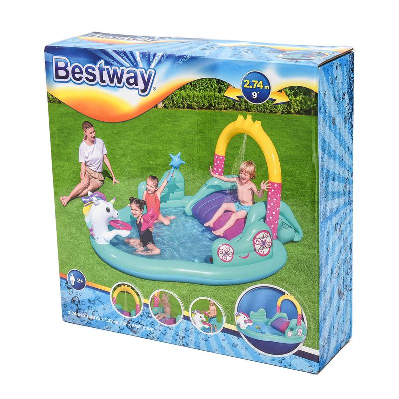 Дитячий ігровий центр Bestway, надувний. Гірка, розбризкувач, надувні іграшки в комплекті. Розмір в розгорнутому вигляді - 274х198х137 см. Об'єм - 220 літрів. Максимальне навантаження - 144 кг. Матеріал - ПВХ. Упаковка - коробка. Розмір - 40х12х40 см.