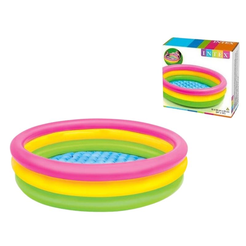 Яркий надувной бассейн для детей от 3 лет. Основные характеристики: • Размер: 147×33 см • Объем воды: 355 литров • 3 надувных кольца разных цветов • Надувне дно для комфорту • Веселые цвета: розовый, желтый, зеленый Идеально подходит для дачи, двора или балкона. Легко надувается и складывается. Безопасный материал, устойчивый к проколам. Поставляется в оригинальной коробке с инструкцией. Дает детям возможность наслаждаться водными играми дома.