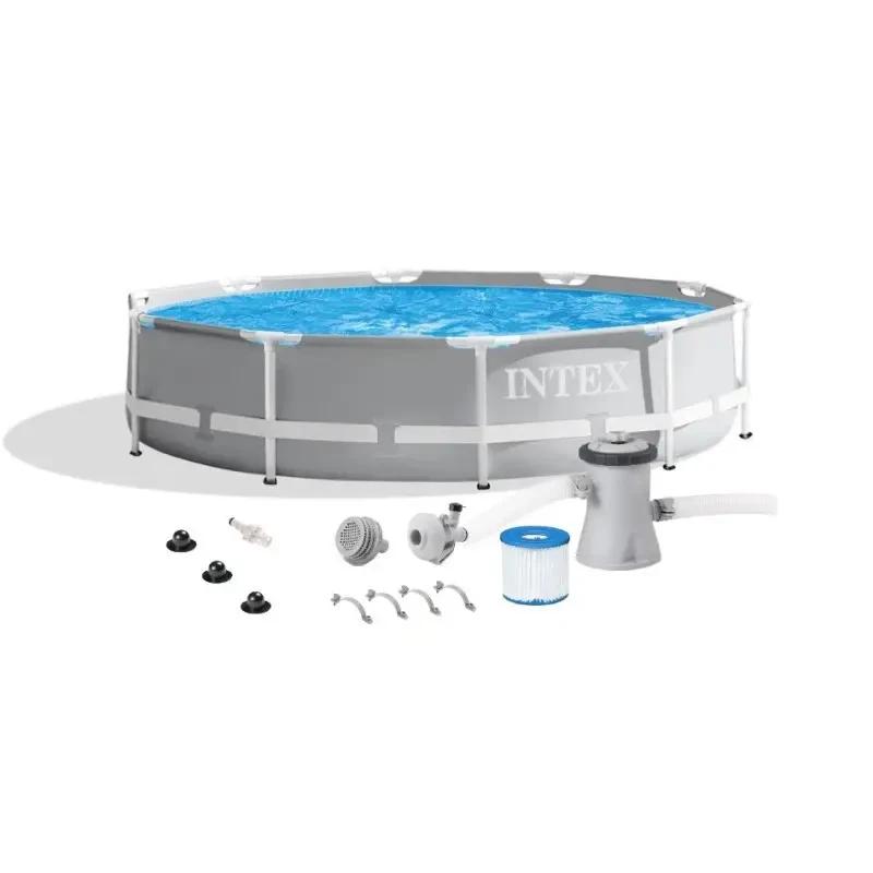 Комплектация бассейна В комплект каркасного бассейна Intex 26702 входит: - картриджный фильтр-насос 1250 л/ч; - два гофрированных шланга для соединения; - сменный картридж 1 шт: тип «Н»; - адаптер для слива воды; Основные характеристики бассейна - Серия: Prism Frame - Структура: Super Tough 3-слойный и износостойкий материал. 3 шара: ПВХ + стекловолоконная сетка + ПВХ - Материал каркаса: оцинкованные стальные трубы - Время сборки: 30 мин - Размер бассейна: (ДхВ): 305 см х 76 см - Емкость воды:4 485 л - Размер коробки: 87.6 см х39.4 см х 28.9 см - Вес упаковки: 19.400 кг