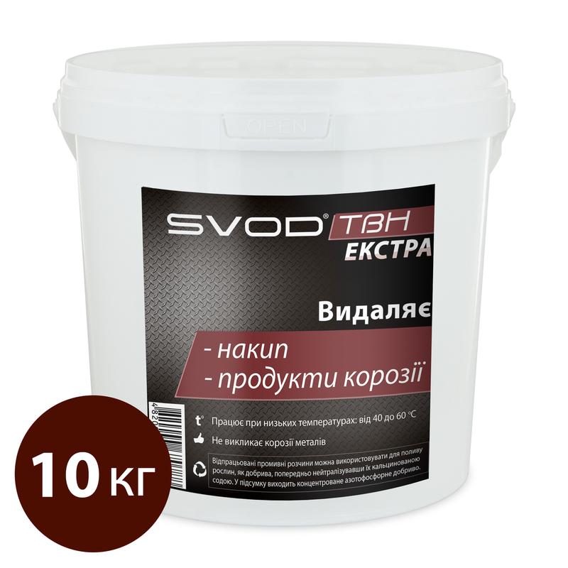 Универсальное средство для удаления накипи и продуктов коррозии. Представляет собой белую субстанцию от сухого до пастообразного состояния. Эффективно и безопасно удаляет отложения ( карбонатно-кальциевые и железоокисные) со всех поверхностей нагрева. Применяется для очистки: теплообменников, котлов, газовых колонок, а также всех типов водонагревателей воды, конденсаторов турбин, испарительных установок, систем отопления и охлаждения. Совместимый: с любым видом металла: алюминий, медь, чугун, черный металл, нержавеющая сталь, кроме оцинкованных поверхностей. На основе "SVOD-ТВН" Экстра готовятся моющие растворы путем растворения расчетного количества средства в воде (1 кг на 10 л воды). Раствор подается в систему и происходит его циркуляция до полного растворения накипи и шлама. Максимальная активность по удалению отложений достигается при температуре моющего раствора 40-60 °C. Процесс промывки сопровождается активным газовыделением. Прекращения газовыделения свидетельствует об окончании процесса промывки, или о снижении концентрации (срабатывания) активного вещества. Чтобы убедиться в окончании процесса отмывания, необходимо в моющий раствор добавить 50 г средства "SVOD-ТВН" Экстра , если газовыделение не возобновилось-оборудование считается отмытым. 1 кг средства -удаляет 0,5 кг отложений! После промывания раствором, оборудование промывается водой. Дополнительная пассивация металлических поверхностей не требуется. Водные растворы на основе "SVOD-ТВН" Экстра не нарушают режима работы очистных сооружений и сливаются в городскую хоз- фекальную канализацию. Меры безопасности: избегать попадания в глаза и на кожу. При работе со средством использовать резиновые перчатки, прорезиненный фартук, защитные очки. При попадании средства "SVOD-ТВН" Экстра и рабочих растворов на кожу, пораженный участок обильно промыть водой и нейтрализовать 3-5% раствором гидрокарбоната натрия (питьевой содой). После промывки накопительного водонагревателя рекомендуем добавлять "SVOD-Professional" Средство для обеззараживания и устранения запаха. Хранить в сухом прохладном месте, недоступном для детей. Состав: активный композит, ингибитор коррозии. ТУ У 20.4-30421760-014:2013 Упаковка - п/э ведро Масса - 10кг