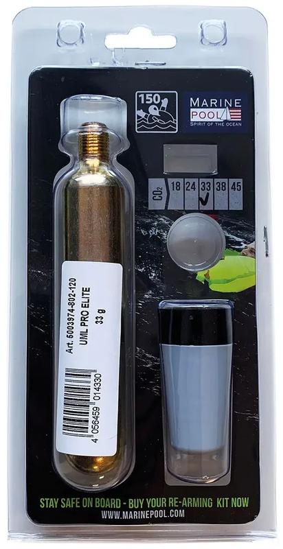 Баллон Marine Pool Recharge Kit является сменным элементом в комплектации само надувающихся спасательных жилетов Marine Pool. После срабатывания устройства надувания жилета его работоспособность восстанавливается путем замены использованного баллона на новый. Баллон заправлен некоторым количеством сжатого СО2. Количество газа может быть различным в зависимости от параметров жилета, для которого он применяется. В комплект прилагается спусковое устройство, которое срабатывает при попадании жилета в воду и крепежный зажим. Баллон Marine Pool Recharge Kit UML Pro Sensor Elite предназначается для перезарядки для жилетов серии UML Pro Sensor Elite.