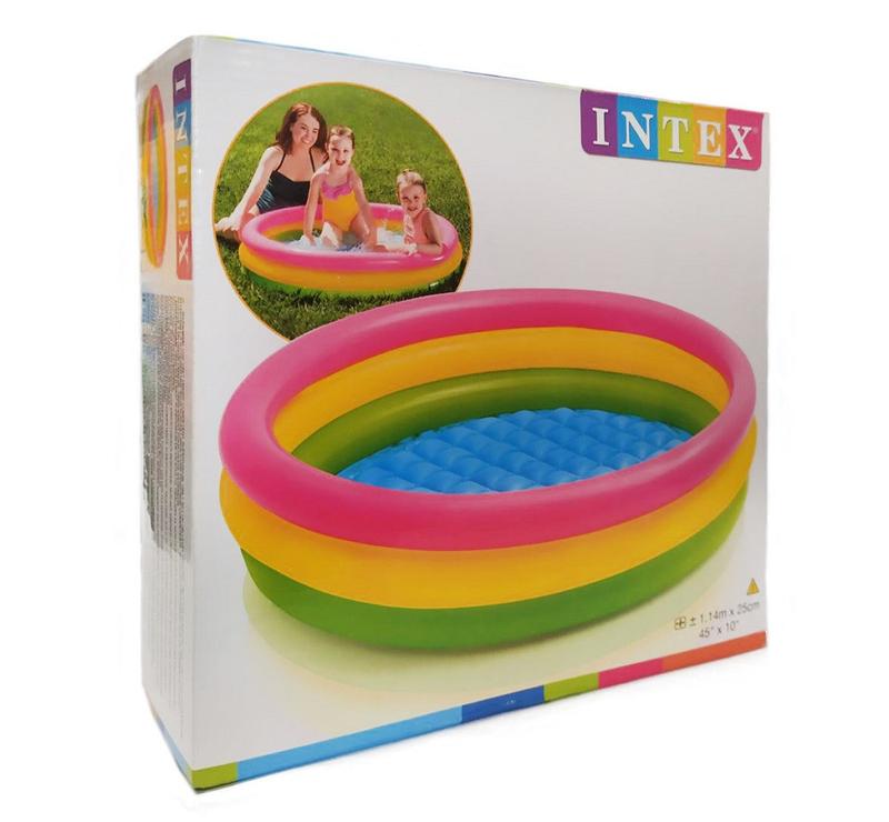 Детский надувной бассейн от производителя Intex. В бассейне: - три кольца; - надувное дно; - объем бассейна 136 литра; - предназначен для купания малышей от трех до шести лет.