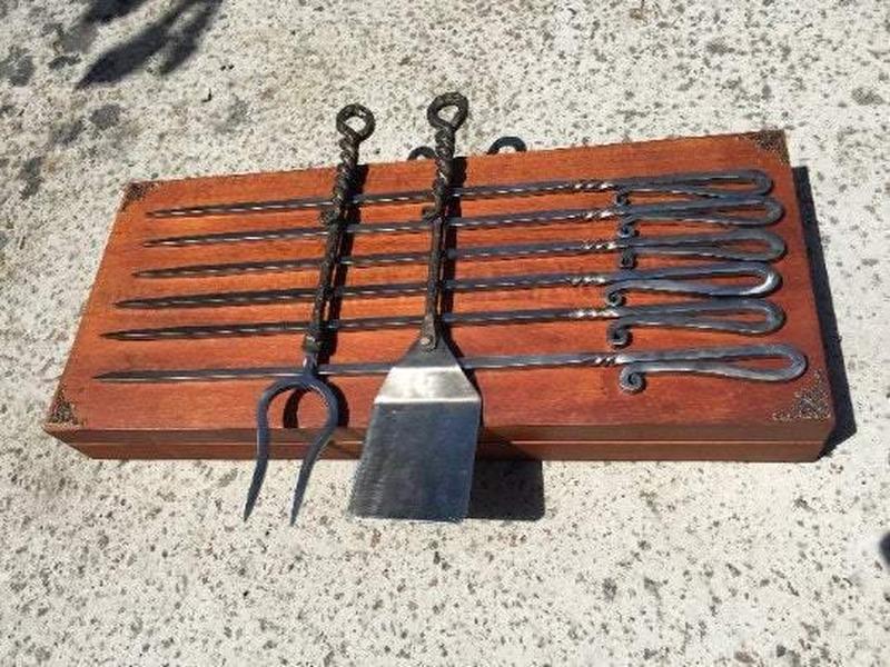 Аксессуары для гриля могут быть не только обычными шампурами, но и настоящим шедевром, который украшает ваш дом и подчеркивает особенности вашего интерьера. Вот собственноручно кованый набор шампуров из нержавеющей стали в деревянной коробке. Инструменты для гриля включают в себя: - Лопатка с собственноручно кованой ручкой и нижней частью из нержавеющей стали - Вилка для барбекю с собственноручно кованой ручкой и нижней частью из нержавеющей стали - 6 нержавеющих стальных шампуров с лезвиями в форме квадрата, загнутыми ручками и текстурой поверхности, выбитой собственноручно Цвет ручек вилки и лопатки: черный, покрытый бронзовой патиной. Размеры: - Длина шпажек: 55 см - Длина вилки и лопатки: 40 см - Вес нетто набора: 5 кг Добавьте шарма своему дому с помощью этих замечательных изделий!