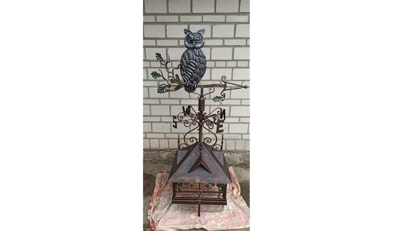 Ищете красивый декор для крыши? Вот он! Это кованая флюгарка в виде совы, сидящей на ветке, которая придаст красоты вашему дому и подчеркнет его внешний вид. Изготовлена в технике художественной ковки, без вырезания или лазерной резки. Насаживается на кирпичную трубу. Размеры совы: - высота: 56 см - ширина: 24 см Общая высота: 160 см Размер кирпичной трубы: 50 см x 50 см Флюгарка будет доставлена несколькими частями в соответствии с объемом и весом. Цвет: черный с частицами медной/серебристой патины, частично зеленый.