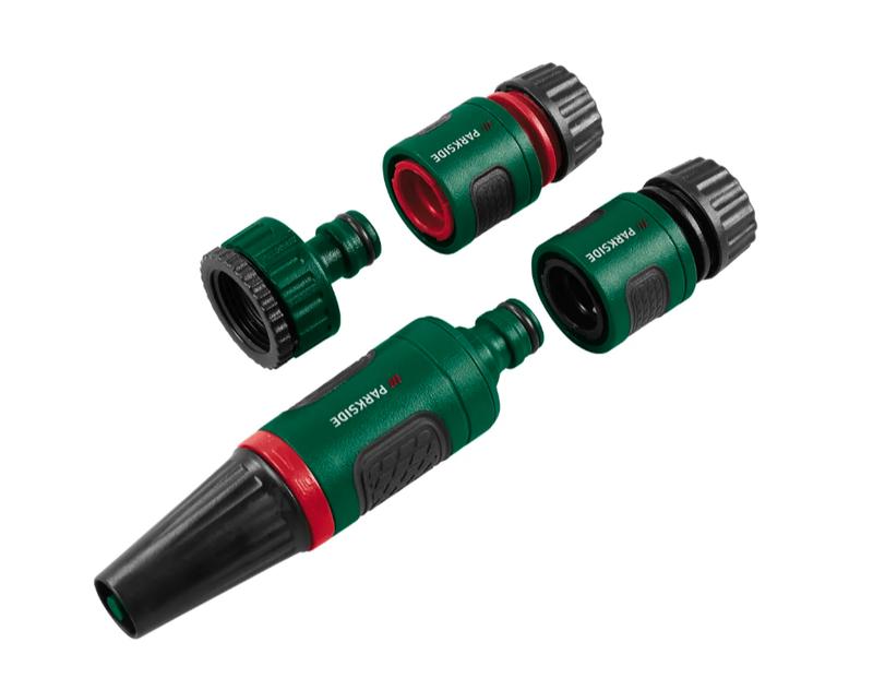 1. Садовый распылитель с системой замыкания Parkside: подходит для обычных систем шлангов (13 - 15 мм/½ - ⅝"). Постоянная регулировка от сильного луча до нежного распыления. Набор из 4 предметов с ручкой с мягкой мягкой поверхностью. Регулируемый распылитель, муфта шланга, муфта шланга с функцией остановки воды и подключение к крану резьбы 26,5 мм (G¾) или 33,3 мм (G1). Устойчив к УФ-излучению и атмосферным воздействиям: Макс. рабочее давление: 4 бар Размеры: Регулируемый спринклер: примерно 3,6 x 13,7 см Шланговый соединитель 13 мм (1/2 дюйма): ок. 5,8 x Ø 3,4/3,2 см Шланговый соединитель 13 мм (1/2 дюйма) с функцией остановки воды: примерно 5,9 x Ø 3,4/3,2 см Подключение к смесителю: примерно 3,7 x 4,3 см