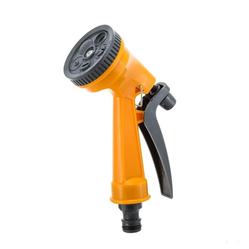 Особливості Пістолет для поливу Presto-PS (7209) використовується для ручного поливу газонів середньої та невеликої площі, городів, квітників, прибирання доріжок на прибудинковій території, миття садового інвентарю та техніки. Поворотна голівка пістолета має 5 положень і регулює форму струменя і ступінь розпилення води. Можливі режими поливу: м'який струмінь, жорсткий струмінь, душ, плаский горизонтальний, три струмені. Підключається до садових шлангів діаметром 1/2, 5/8 і 3/4 дюйма за допомогою стандартних конекторів. Рекомендований робочий тиск у системі від 2 до 4 атмосфер. Виготовлений пістолет для поливу з якісного пластику, довговічний, стійкий до механічних пошкоджень, впливу ультрафіолету і водорозчинних добрив. Переваги - Зручність і простота підключення; - Універсальність використання - 5 режимів подачі води; - Зміна режиму роботи простим поворотом голівки; - Фіксація курка для тривалого поливу; - Дозволяє вносити водорозчинні добрива; - Надійна, обслуговувана конструкція. Коротка інструкція з підключення зрошувального пістолета: 1. Підключити гнучкий садовий шланг через кран до джерела водопостачання; 2. За допомогою конектора з аквастопом підключити шланг до пістолета; 3. Обрати необхідний режим поливу; 4. Увімкнути пістолет натисканням на курок.