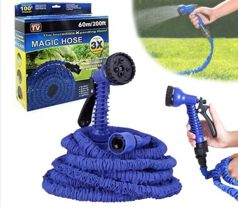Садовый поливочный шланг Magic Hose 60 м Водяной шланг или шланг для полива довольно часто используется для различных целей, таких как уход за садом, мойка машины, очистка фасада и прочее. Основная проблема армированных и резиновых шлангов заключается в их тяжелом весе и склонности к запутыванию и переламыванию. На сегодня уже хорошо себя зарекомендовавшим есть гофрированный шланг Magic Hose, который под напором воды способен увеличиваться в длину в три раза. Такой шланг не перекручивается, очень легкий и компактный. Его не нужно распутывать. Просто подсоединяете к системе полива, подаете воду, и шланг сам распутается и будет готов к использованию. Этот удивительный шланг Магик Хоз автоматически увеличивается в длину в три раза, а затем при отключении воды также автоматически сжимается до первоначального размера. Почему именно шланг Xhose? Лёгкий и компактный. Не перекручивается и не переламывается. Удобен в хранении. Вес шланга Xhose меньше килограмма. Подготовка к работе в течении нескольких секунд. Наличие в комплекте распылителя с различными вариантами распыления воды. Характеристики: Вид: для полива. Диаметр: 25 мм. Длина: 60 м (в растянутом состоянии) и 20 м (в сжатом состоянии). Материал: тканное полиэфирное полотно, латекс.
