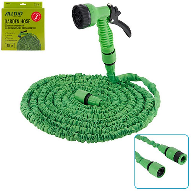 Растягивающийся шланг Alloid Garden Hose с распылителем — удобное решение для полива и мойки, автоматически изменяет длину под напором воды. Легко хранить и использовать в саду или на даче. Характеристика товара: - Длина: до 15 м в растянутом состоянии, 5 м в сложенном - Материал: многослойная ткань с эластичным латексом внутри - Комплектация: шланг, пистолет-распылитель с регулировкой режимов, быстросъёмные коннекторы - Режимы распыления: до 8 типов струи (шторм, дождь, конус, плоский, туман и др.) - Давление воды: от 0,5 до 8 бар - Соединение: стандартные ½,” штуцеры, совместимые с большинством кранов и коннекторов Преимущества: - Автоматическое растягивание/сворачивание — без лишних усилий, не запутывается - Лёгкость и компактность — шланг весит всего около 1 кг в сложенном виде - Универсальность распылителя — 8 режимов для полива, мойки авто, бытовых нужд - Прочность на излом — прочный латекс выдерживает высокое давление - Простота подключения — быстросъёмные коннекторы без инструментов