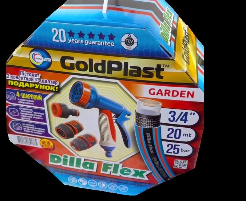 Набір для поливу GoldPlast Dilla Flex – це якісне та зручне рішення для догляду за садом і газоном. Включає в себе гнучкий 4-шаровий шланг довжиною 20 метрів діаметром 3/4", багатофункціональний поливальний пістолет та необхідні з'єднувальні елементи. \n Переваги товару: Міцний 4-шаровий шланг – захист від перегинів та розривів Витримує тиск до 25 бар – підходить для інтенсивного використання Універсальний поливальний пістолет – кілька режимів розпилення води У комплекті адаптер і 2 конектори – швидке підключення до системи водопостачання \n Призначення: Ідеально підходить для поливу саду, городу, газону, клумб, а також для миття авто та прибудинкової території. \n Бренд: GoldPlast Діаметр шланга: 3/4" Довжина: 20 м Максимальний тиск: 25 бар \n Цей набір стане незамінним помічником у вашому саду, забезпечуючи комфортний та ефективний полив!