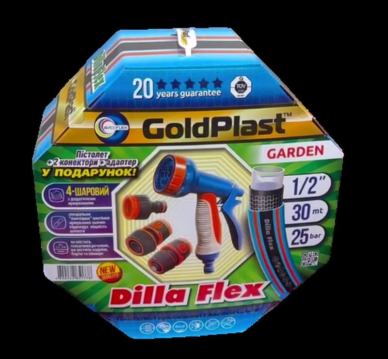 Набір для поливу GoldPlast Dilla Flex – це якісне та зручне рішення для догляду за садом і газоном. Включає в себе гнучкий 4-шаровий шланг довжиною 30 метрів діаметром 1/2", багатофункціональний поливальний пістолет та необхідні з'єднувальні елементи. \n Переваги товару: Міцний 4-шаровий шланг – захист від перегинів та розривів Витримує тиск до 25 бар – підходить для інтенсивного використання Універсальний поливальний пістолет – кілька режимів розпилення води У комплекті адаптер і 2 конектори – швидке підключення до системи водопостачання \n Призначення: Ідеально підходить для поливу саду, городу, газону, клумб, а також для миття авто та прибудинкової території. \n Бренд: GoldPlast Діаметр шланга: 1/2" Довжина: 30 м Максимальний тиск: 25 бар \n Цей набір стане незамінним помічником у вашому саду, забезпечуючи комфортний та ефективний полив!