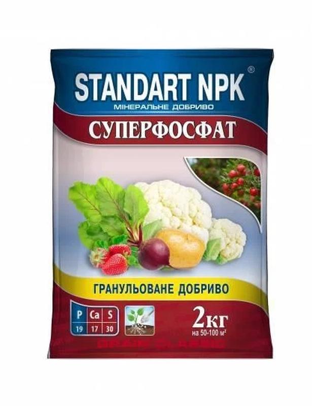 Суперфосфат - універсальне фосфорно-сірчане гранульоване передпосівне добриво, призначене для застосування під всі с/г культури, на всіх ґрунтах, незалежно від їх структури та хімічного складу.Крім високого вмісту фосфору P2O5 19%, характеризується наявністю у складі сірки SO3 30%, а також кальцію CaO 17% Фосфор (P2O5) у цьому добриві знаходиться у розчинній формі - у вигляді оксиду фосфору P2O5, що дозволяє рослинам швидко засвоювати його. Фосфор підвищує врожайність, поліпшує смакові та поживні властивості плодів, суттєво покращує імунітет рослин, сприяє розвитку кореневої системи та бульб, уповільнює старіння культур та продовжує період плодоношення. Сірка (SO3) у складі , допомагає краще засвоюватись азоту та іншим елементам живлення. Забезпечує надбавку врожаю до 15% у зернових, і до 25% в інших культур. Підвищує стійкість до стресів та якість продукції. Кальцій (CaO) має властивість розкислювати ґрунт, що в свою чергу підвищує ефективність використання мінеральних добрив в середньому на 30%. Сприяє нормальному протіканню біохімічних процесів. Формує міцні клітинні стінки, що дозволяє рослинам протистояти хворобам та механічному впливу.