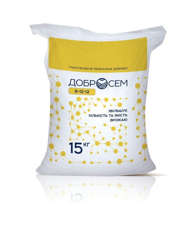 Удобрение Добросем является комплексом макро- и мезоэлементов. В его составе присутствует органический комплекс Евростом, который был разработан учеными для активации роста растений и развития корневой системы. Формула удобрения Добросем 8-12-12 + сера и комплекс Евростом Органик. Добро-сем является универсальным комплексным минеральным удобрением, которое разработано для подкормки зерновых, колосовых, технических и зерносторонних культур. Это гранулированное удобрение постепенно высвобождается в почве в течение сезона вегетации, способствуя постепенному подпитке растений и поддержанию во время всех фаз. Добросем можно использовать при предпосевной обработке почвы и при севе на любом типе почвы. Фосфор в составе удобрения способствует активному росту корневой системы, азот способствует наращиванию зеленой массы, а калий повышает устойчивость к засухе, стрессам и участвует в формировании генеративных органов и запыления. Комплекс Евростом содержит органические соединения, которые способствуют восстановлению почвы и повышают ее плодородие. Преимущества минерального удобрения Добросем: - Увеличение урожайности и улучшение качества урожая. - Стимулирование роста и развитие корневой системы на начальных этапах. - Повышение жизнеспособности растений. - Обеспечение сбалансированного питания. - Хорошо растворяется в грунте и подходит для любого типа почвы. Ціна за 1 кг