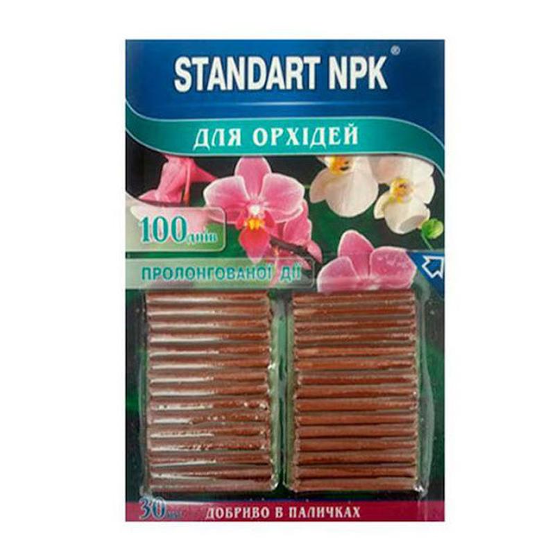 STANDART NPK палички для орхідей -- мінеральне добриво пролонгованої дії, яке забезпечує рослину поживними речовинами. Вміст магнію впливає на процеси дихання, які є надважливими для орхідей, в свою чергу азот та калій сприяють здоровому росту. Добриво Standart NPK легкозасвоюване та зручне у використанні. Палички поступово розчиняються під час поливу рослин, забезпечуючи живлення протягом 3-х місяців. Завдяки тому, що поживні елементи вивільняються поступово і дозовано, рослинам не загрожує перенасичення добривом, відсутній ризик сольового стресу. Standart NPK надовго забезпечить привабливий та здоровий вигляд Ваших рослин! СПОСІБ ЗАСТОСУВАННЯ: Палички занурюють в субстрат на відстані 1-3 см від краю горщика на глибину 4-5см. Після закладання добрива рослини необхідно полити відстояною водою кімнатної температури. Фасування: 30 шт.
