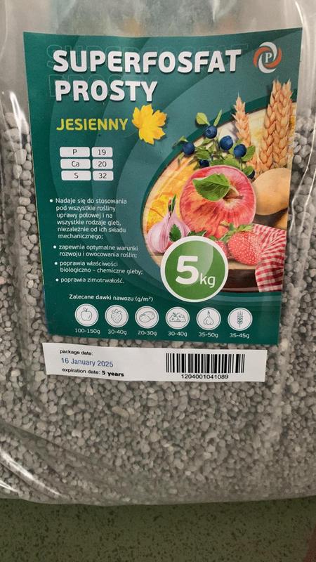 Простой суперфосфат – это одно из наиболее распространенных и доступных фосфорных удобрений. Вот основная информация о нем: Состав: Основным действующим веществом является фосфор в виде водорастворимых фосфатов. Содержание фосфора (в пересчете на P2О5) обычно составляет 16-20%. Кроме фосфора, простой суперфосфат содержит: Кальций (Ca) – около 17-20% (в виде CaO). Сера (S) – около 25-30% (в виде SO3.) Также могут присутствовать в небольших количествах другие элементы, такие как магний, бор, медь, марганец, цинк. Характеристики: Выпускается в виде гранул или порошка светло-серого цвета. Гранулированная форма удобнее в применении, меньше пылит и обладает лучшей сыпучестью. Хорошо растворим в воде, что обеспечивает доступность фосфора для растений. Эффективен на различных типах почв, особенно на щелочных и нейтральных. На кислых почвах его эффективность может снижаться из-за связывания фосфатов алюминием и железом. Применение: Простой суперфосфат используется для: Основного внесения под вспашку или перекопку почвы осенью или весной. Это обеспечивает фосфором растения на протяжении всего вегетационного периода. Нормы внесения зависят от культуры и плодородия почвы и могут составлять от 40-50 г/м² на окультуренных почвах до 60-70 г/м² на неокультуренных. Припосевного внесения непосредственно в рядки или лунки при посадке семян или рассады. Небольшое количество удобрения (2-3 г на погонный метр или 3-4 г в лунку) способствует лучшему укоренению молодых растений. Подкормок в течение вегетации. Удобрение вносят в сухом виде с последующей заделкой в почву (15-20 г/м²) или в виде водного раствора (20-30 г на 10 л воды). Преимущества: Обеспечивает растения необходимым фосфором, который важен для развития корневой системы, цветения и плодоношения. Содержит серу и кальций, которые также являются важными элементами питания. Улучшает качество плодов, повышает их сахаристость и содержание полезных веществ. Способствует более раннему созреванию урожая.