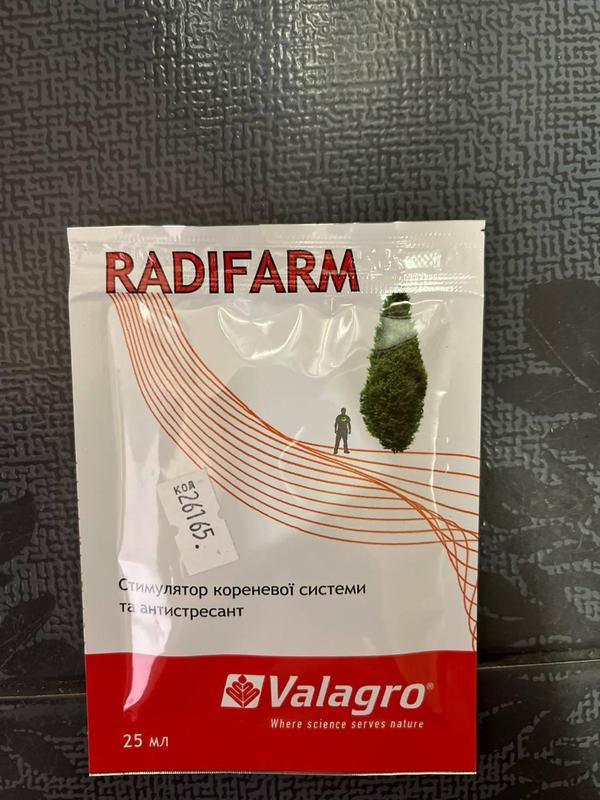 Биостимулятор роста корневой системы, укоренитель Radifarm 25 мл Биостимулятор роста, применяемый после высадки или пересадки всех видов растений для укоренения, восстанавливает корни после повреждений (вредителями), в том числе в тяжелых случаях. Также подходит для замачивания рассады, семян, подкормки черенков. Выводит растения из состояния ступора, отлично обновляет после сбора урожая, стимулирует выработку гормонов, что делает растения более устойчивыми к температурным перепадам. Радифарм применяется для фертигации садов и ягодников в начале сезона, подлежит гибкой дозировке, абсолютно безопасно для человека и окружающей среды. Для лучшего эффекта его следует применять совместно с минеральным удобрением Мастер 13.40.13. Применяется: Для всех видов растений (роз и цветущих культур, комнатных растений, овощных культур, плодово-ягодных культур) Способ внесения: Фертигация, обработка семян, замачивание саженцев Химический состав: В составе биостимулятора Radifarm присутствуют: Органо-минеральное NK 3-0-8 Жидкое удобрение с цинком (Zn) Азот (N) - 3% (органический азот 1% (1,2%), азот мочевинный 2% (2,4%) Оксид калия (К2О) - 8% (9,7%); Органический углерод биологического происхождения (С) - 10% (12,0%); Цинк Водорастворимый (Zn) - 0,1% (0,12%); Цинк хелатированный ЭДТА (Zn) - 0,1% (0,12%); Так же присутствуют: Полисахариды (аргинин и аспарагин) Органические элементы Полипептиды Стероидные гликозиды Свободные аминокислоты Витамины (В1, В2, D, Н, РР) Кислотность, рН (1% раствора) - 5,0 Назначение: Для улучшения укоренения рассады и саженцев. Сокращение стресса после пересадки (выход растения из состояния ступора). Увеличение площади поглощения культурами питательных веществ (площади питания). Стимуляция роста латеральных корней, играющих основную роль в питании. Восстановление корневой системы после повреждения вредителями, орудиями обработки почвы, подмерзания. Для фертигации ягодников и садов в начале сезона. После обработки Radifarm улучшается эффективность дальнейшего внесения Actiwave. Механизм действия: Аминокислоты, протеины, сапонины, витамины и цинк стимулируют образование новых клеток, как следствие, рост существующих корешков и появление новых. Эти же составляющие помогают многолетним насаждениям поддерживать активное развитие корневой системы. Бетаин и полисахариды снимают стресс и индуцируют восстановление корневой системы. Достоинства: Radifarm - это комплекс биологически активных веществ природного происхождения. Не только стимулирует растение к укоренению, но и снабжает его необходимыми ресурсами. Антистрессанты в составе продукта, направленные на восстановление поврежденной корневой системы, усиливают способность к впитыванию влаги и здоровых растений. Подходит для смешивания с протравителями и микроудобрениями. Применение препарата: Под корень: 25 мл на 10 литров воды - все виды растений (2-4 литра готового рабочего раствора вылить под каждое растение при пересадке (высадке) и еще 2-3 раза с интервалом 7 дней) Норма для отдельных культур: 25 мл на 10 литров воды - картофель (6 литров рабочего раствора на 1 кв.м. площади) 25 мл на 10 литров воды - газон и травы (600 мл рабочего раствора на 1 кв. м. площади, через неделю - повторное внесение, но 400 мл на 1 кв. м.) 25 мл на 10 литров воды - виноград (весенний полив, 3 обработки, через каждые 7 дней) 25 мл на 10 литров воды - декоративные деревья, расте