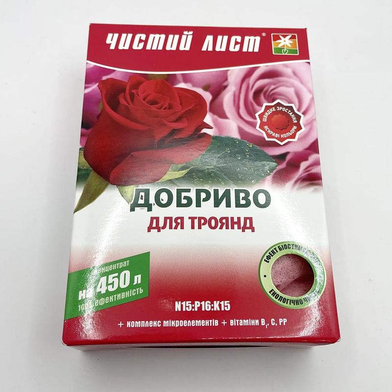 Добриво, захист рослин Чистий Лист Розкрийте всю красу ваших троянд з кристалічним добривом "Чистий Лист"! Це збалансоване мінеральне живлення, розроблене спеціально для задоволення потреб цих ніжних квітів. "Чистий Лист" забезпечує: Пишне та тривале цвітіння: Насолоджуйтесь рясним каскадом бутонів, що розквітають у всій своїй красі. Яскраве забарвлення пелюсток: Підсилює інтенсивність кольору, роблячи кожну троянду справжнім витвором мистецтва. Міцне здоров'я та імунітет: Захищає від хвороб та шкідників, зміцнюючи стебла та листя. Легке засвоєння: Кристалічна форма забезпечує швидке розчинення та проникнення поживних речовин у кореневу систему. Забудьте про бліде листя та слабке цвітіння! "Чистий Лист" – це запорука здорових, квітучих троянд, що тішитимуть вас своїм неперевершеним виглядом протягом усього сезону. Подаруйте своїм трояндам професійний догляд, і вони віддячать вам букетом розкішних квітів!