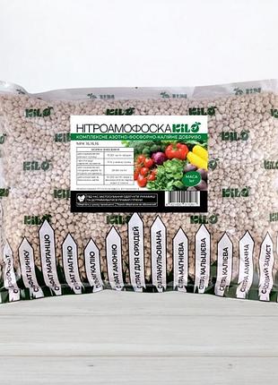 Нитроаммофоска 1 кг — это универсальное комплексное минеральное удобрение, содержащее три основных элемента питания растений: азот (N), фосфор (P) и калий (K). Благодаря сбалансированному составу, средство подходит для большинства сельскохозяйственных, садовых и декоративных культур, обеспечивая активный рост, развитие и обильное плодоношение. Преимущества удобрения - Содержит все необходимые макроэлементы — азот, фосфор и калий. - Способствует быстрому росту растений и формированию сильной корневой системы. - Повышает урожайность и улучшает вкус плодов и овощей. - Улучшает устойчивость растений к неблагоприятным погодным условиям и заболеваниям. - Подходит для всех типов почв и используется как весной, так и осенью. Состав Действующие вещества: Азот (N) — 16%; Фосфор (P₂O₅) — 16%; Калий (K₂O) — 16%. Соотношение NPK: 16:16:16. Способ применения Овощные культуры: 20–30 г на 1 м² при перекопке весной или осенью. Плодовые деревья и кустарники: 40–60 г на 1 м² приствольного круга весной. Декоративные растения и газоны: 15–25 г на 1 м² во время активного роста. Масса: 1 кг Форма: гранулы, хорошо растворимые в воде. Тип удобрения: комплексное (азотно-фосфорно-калийное). Нитроаммофоска — это эффективное универсальное удобрение, которое обеспечивает растения полноценным питанием, улучшает структуру почвы и способствует получению высокого и качественного урожая.