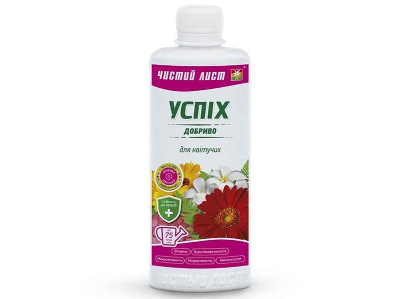 Область застосування і властивості «Успіх для квітучих рослин» складне мінеральне добриво з комплексом біологічно активних речовин, що містить всі необхідні макро- та мікроелементи в доступній формі для повноцінного живлення, стимулює розвиток кореневої системи рослини, пригнічує розвиток патогенної мікрофлори. Підвищує стійкість до захворювань, запобігає розвитку хлорозу.