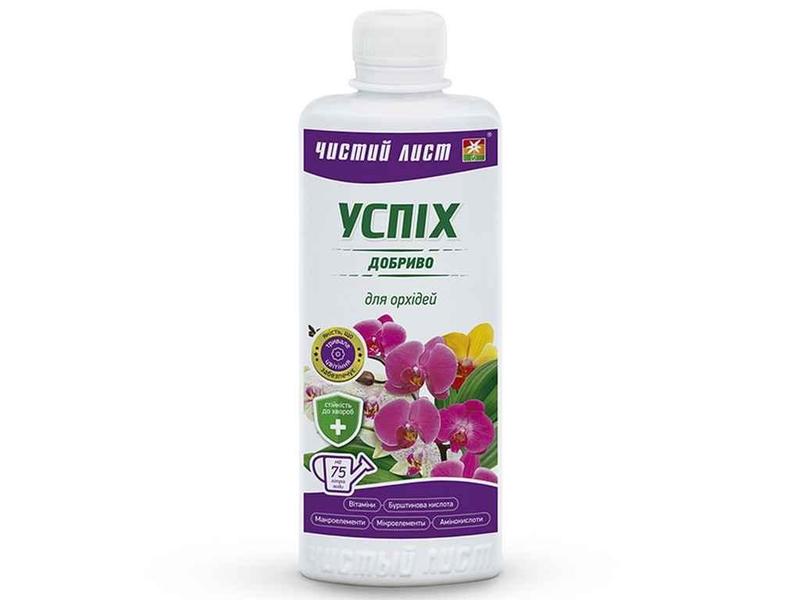 «Успіх для орхідей» складне мінеральне добриво з комплексом біологічно активних речовин, що містить всі необхідні макро- та мікроелементи в доступній формі для повноцінного живлення, стимулює розвиток кореневої системи рослини, пригнічує розвиток патогенної мікрофлори. Підвищує стійкість до захворювань, запобігає розвитку хлорозу.