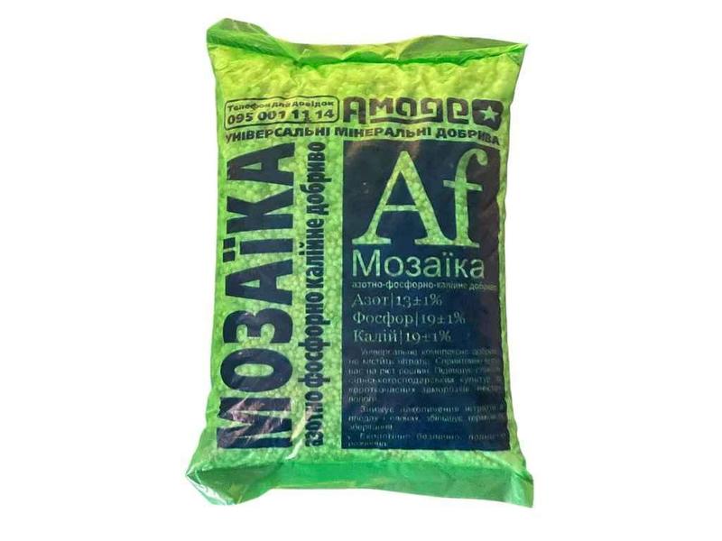 Комплексне універсальне добриво Мозаїка 1 кг, % - NPK 13:19:19 Мозаїка - високоефективне універсальне азотно-фосфорно-калійне добриво. вміст азоту N13%, фосфору P19%, калію K19%. Добриво Мозаїка NPK вихідні складові: амофос, карбамід, а також сіль. Мозаїка NPK має хороші фізико-механічні властивості та придатна для механізованого внесення до ґрунту як гранульоване добриво. Застосовується на всіх типах ґрунтів, під усі сільськогосподарські культури в основне осіннє, весняне внесення, а також для підживлення. Застосування: Для підгодівлі ягідних дерев та ягід використовують 25-30 г на 1 м.кв.; Суницю та полуницю підгодовують провесною і після збору врожаю по 15-20 г на 1 метр рядка; Картопля та овочі - 1 чайна ложка на лунку; Кімнатні та балконні квіти поливати розчином 10-15 г на 10 л води. Під час роботи ¦дотримуватися правил гігієни. Зберігати у сухому приміщенні. Термін придатності не обмежений