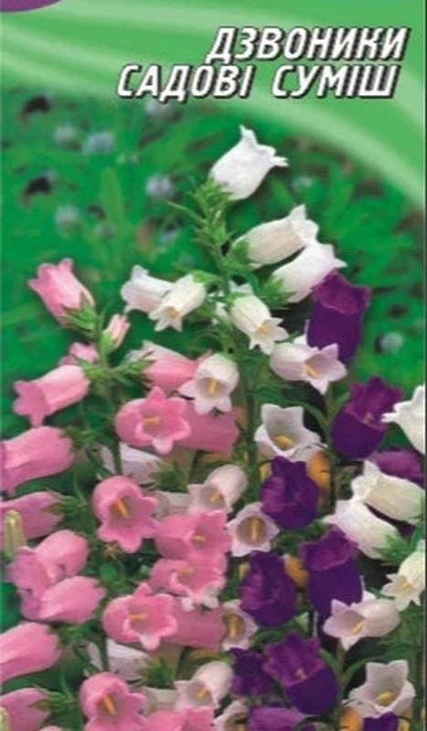 КОЛОКОЛЬЧИК САДОВИЙ суміш Родина дзвоникових. Багаторічник. Рослина висотою від 60 до 100 см, квіти до 7 см в діаметрі, різноманітного кольору. Холодостійка, світлолюбна. Використовують в групових посадках на клумбах, рабатках, міксбордерах, кам’янистих ділянках, на зріз і для вигонки. Можна сіяти під зиму. Термін 2025 рік
