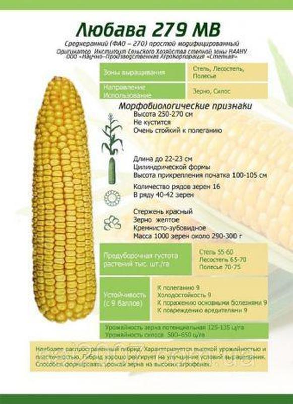 Характеристика гібриду Любава 279 МВ Простий модифікований середньоранній гібрид кукурудзи, створений в Інституті зернового господарства сумісно з ТОВ «Степова». Рослини не кущаться. Качани циліндричної форми довжиною 22-23 см. Стрижень в першому поколінні червоний. Вихід зерна 80-85%. Зерно жовте. Насіння на ділянках гібридизації вирощується на стерильній основі за схемою повного відновлення. Співвідношення батьківських форм 6:2. Форма верхівки першого листка - від загостреної до округлої. Антоціанове забарвлення піхви першого листка - помірне, кут між листковою пластинкою і стеблом - середній. Антоціанове забарвлення повітряних коренів стебла - помірне. Час повного цвітіння ( середня третина головної осі волоті, 50 % рослин) - середній. Антоціанове забарвлення колоскових лусок - помірне. Волоть середньої щільності. Бічні гілочки за довжиною - середні, положення на нижній третині волоті - ледь відхилене, кількість первинних бічних гілочок волоті - мала, головна вісь волоті за довжиною - коротка. Час появи ``шовку" (у 50 % рослин) - від раннього до середнього, відсутнє антоціанове забарвлення "шовку". Пластинка листка за шириною ( аналізуючи листок верхнього качана, см) - середня. Ніжка качана за довжиною - середня. Качан за формою конусно- циліндричний, за довжиною - середній, кількість зернових рядів середня, колір верхівки зернини - жовто-оранжевий, низу зернини - оранжевий. Антоціанове забарвлення лусок стрижня сильне.