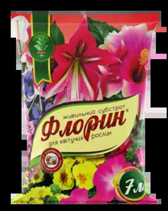 Діюча речовина: суміш торфів, подрібнений кокос, кокосове волокно, органічні домішки, перліт, вапнякові матеріали, пісок, добрива. Властивості: знижує стрес рослини при пересаджуванні; покращує схожість насіння, приживлюваність розсади, живців та саджанців; повітро- і водопроникна структура субстрату забезпечує розвиток міцної кореневої системи; створює комфортні умови росту для рослин, підвищує імунітет; пригнічує розвиток шкідливої мікрофлори; позбавлений насіння бур’янів, шкідників та збудників хвороб; кожна суміш враховує індивідуальні потреби будь-якого виду рослин в кількості поживних речовин та складі субстрату. Флорин – живильний субстрат, який виробляється з суміші торфів із додаванням подрібненого кокосового волокна, перліту, органічних домішок, вапнякових матеріалів, піску. Містить повний набір поживних елементів: макро- та мікроелементів. Спеціальні ґрунти серії Флорин дозволяють підійти до вирощування кімнатних декоративних рослин професійно, використовуючи правило «Кожній рослині – свій ґрунт». Від інших серій субстратів серія Флорин відрізняється наявністю різних сумішей для кожного виду рослин, враховуючи індивідуальні вимоги рослини до поживності і складу ґрунту. Призначення: для вирощування всіх видів квітучих кімнатних і садових рослин (фіалок, антуриумів, кампанул, петуній, бегоній, фуксій, бальзамінів, глоксиній та інших), висіву насіння, вкорінення черешків і розсади. Ефективність: створює умови для проростання насіння, покращує приживання розсади, живців і черешків, гарантує розвиток потужної кореневої системи, забезпечує активне та довготривале цвітіння, збільшує розміри та підсилює інтенсивність забарвлення квітів та листя.