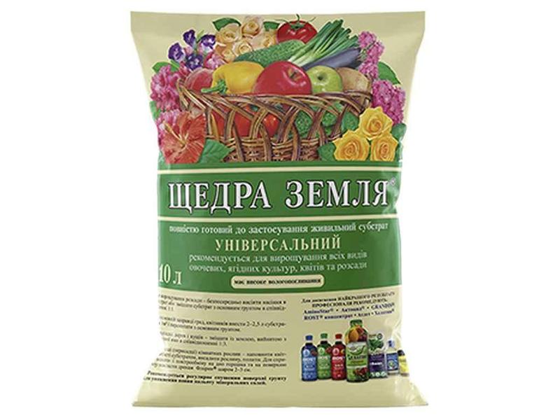 Діюча речовина: суміш торфів, подрібнений кокос, кокосове волокно, органічні домішки, перліт, вапнякові матеріали, пісок, добрива Властивості: покращує умови проростання насіння і приживлюваність розсади, живців та саджанців; сприяє коренеутворенню завдяки волого- та повітропроникній структурі; забезпечує розсаду елементами, необхідними для закладання генеративних органів; покращує декоративні властивості кімнатних рослин; забезпечує прискорений ріст та розвиток рослин; є стерильним від насіння бур’янів, шкідників і збудників захворювань. Щедра земля® – повністю готовий торф’яний живильний субстрат, який виробляється з суміші українських та прибалтійських торфів, збагачених макро- та мікроелементами (в хелатній формі), з додаванням подрібненого кокосу, кокосового волокна, органічних домішок, агроперліту, вапнякових матеріалів і піску. Суміш компонентів, збагачених макро- та мікроелементами, створює близькі до ідеальних умови ґрунту для вирощування рослин: поживні елементи, аерація, водопроникність і вологопоглинання, стерильність від шкідників, збудників хвороб та насіння бур’янів. Призначення: для висіву насіння, пікіровки та вирощування розсади овочевих, ягідних, квіткових та декоративних культур. Ефективність: покращує схожість насіння, приживаність розсади, зменшує стрес при пересадці рослин; підвищує врожайність і смакові якості овочів, плодів та ягід; покращує декоративні властивості кімнатних і садових рослин; забезпечує прискорений ріст, розвиток і дозрівання плодів. Добрива - 1,2 кг/м3 рН - 5,5-6,5 Компоненти: верховий, перехідний, низинний торф, подрібнений кокос, кокосове волокно, органічні домішки, перліт, вапнякові матеріали, пісок