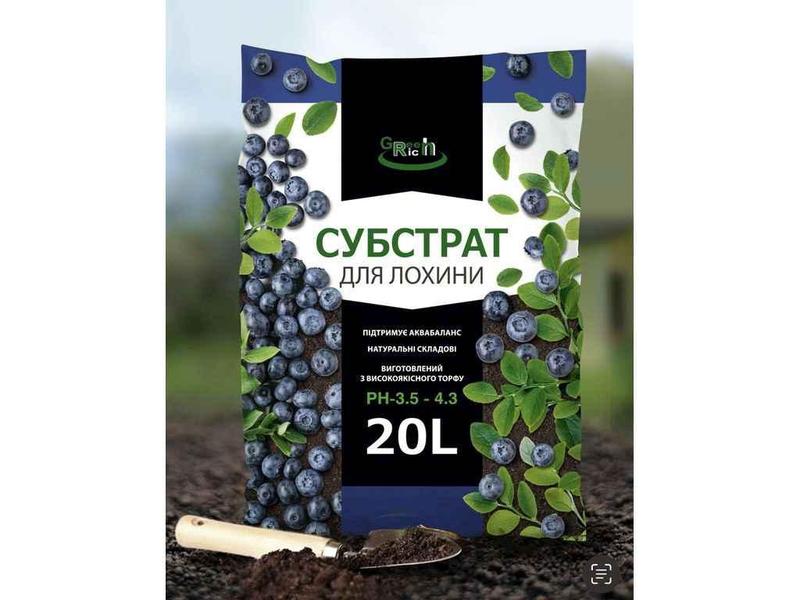 Склад субстрату для Лохини (голубіки): Торф верховий Агроперліт Соснова мульча (подрібнена кора) Комплекс мінеральних добрив Кислотність субстрату – pH - менше <4,0 Упаковка – міцний поліетиленовий пакет 20 л