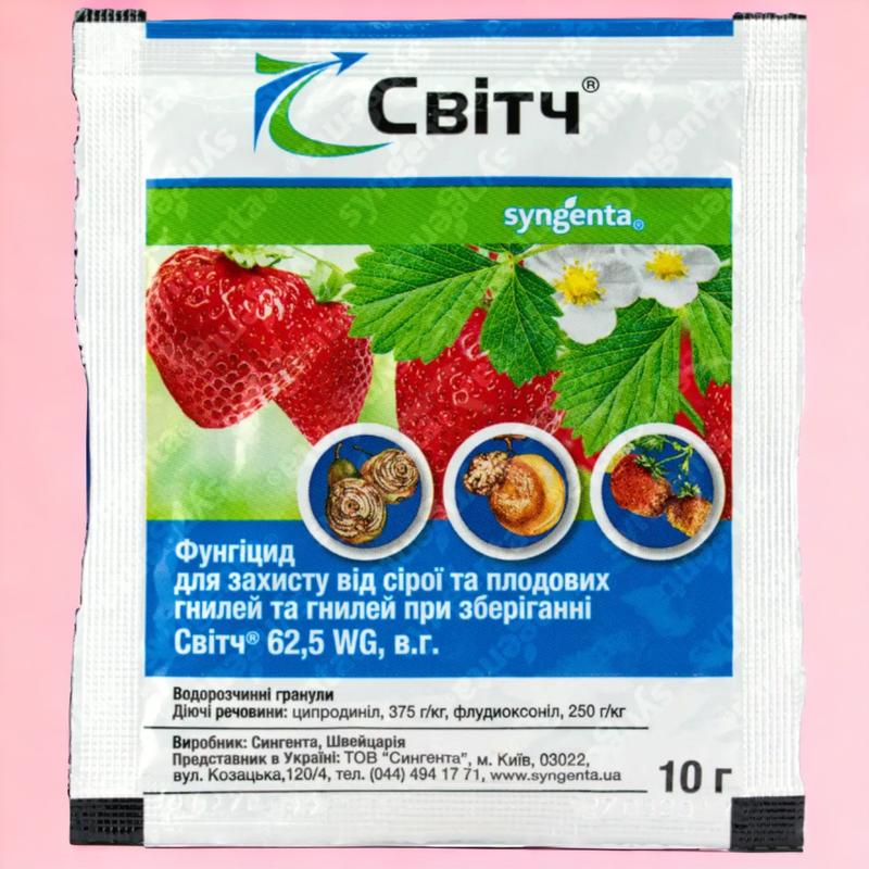 Фунгицид контактно-системного действия Свитч Сингента Швейцария Универсальный комбинированный фунгицид свитча применяется для овощных и плодово-ягодных культур, который охватывает довольно широкий спектр грибковых и бактериальных заболеваний, мгновенно уничтожает споры и мицелии грибов. Благодаря действующим двум веществам ципродинила и флудиоксонила, средство поглощается растениями и защищает их от повторного поражения заболеваниями. Фунгицид контролирует главных возбудителей болезней, вызывающих гниение плодов и ягод при хранении. Свитч компании Сенгента применяется для защиты абрикоса, персика, сливы, черешни, груши, винограда, яблоны, клубники, томатов, огурцов, розы, черники от плодовой гнили, серой гнили, монилиоза, сизой плесени, фузариозной; дью, парши, мучнистой росы, антракноза. Преимущества контактно-системного фунгицида Свитч Сингента - Препарат не является токсичным для растений и не наносит вреда окружающей среде - Данный фунгицид контролирует широкий спектр грибковых и бактериальных заболеваний - Средство не смывается осадками в течение 2-х часов после обработки - Фунгицид Свитч не вызывает резистентности у растений - Данное средство улучшает лежкость плодов при хранении Инструкция, способ применения, состав, дозировка и норма расхода фунгицида Свитч 62.5 WG в.г. 10 г Культура и норма расхода препарата Свитч: Культура Норма расхода препарата, г/10 л Норма расхода рабочей жидкости, л/сотка, дерево Вредные объекты Земляника 8-10 4-5 Серая гниль, мучнистая роса, белая и бурая пятнистость Яблоня, груша, абрикос, персик, слива, черешня 8-10 2-5 Плодовая гниль, парша, мучнистая роса Розы (открытый и закрытый грунт) 8-10 0,5 на куст Серая гниль, альтернариоз, фузариоз Томаты, огурцы 8-10 5 Серые и мокрые гнили, антранкоз, фузариоз Действующее вещество: ципродинил 375 г/кг, флудиоксонил 250 г/кг. Обратите внимание: товар содержит разновидности, при оформлении заказа, пожалуйста, выберите предпочитаемый вид товара!