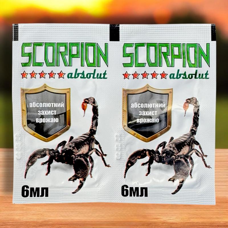 Скорпион Абсолют Универсальный двухкомпонентный инсектицид против вредителей почвы. На разных степенях их развития. Препарат предназначен для борьбы: колорадский жук, медведка, майские жуки, тля, гусеницы, волокиты, бело-крылышки, совки, нематоды. Препарат оказывает продолжительное действие, а также активен при повышенных температурах. Инсектицид не накапливается в растениях и почве. Используется для капельного орошения и приготовления приманок. В баковых смесях имеет совместимость со многими удобрениями и пестицидами. Действующее вещество: Фипронил 250г/л, Зета-Циперметрин 100г/л. Норма расходов: Опрыскивание-6мл в 10л воды на 2сотки. Приготовление приманки-6мл на 2кг любого сваренного зерна, добавить 1 ст. ложки подсолнечного масла. Готовую приманку заложить в грунт на глубину 3-5 см по всему периметру за 1-2 недели до высадки культур. Кратность обработки: 2 раза в сезон Срок ожидания: 30 дней
