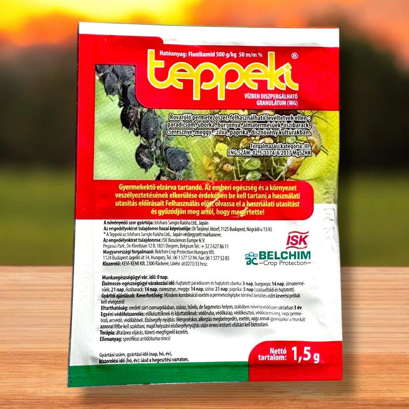 Теппеки - эффективный препарат для борьбы со злостными вредителями плодовых и овощных культур. Препарат зарегистрирован в странах ЕС, Северной и Южной Америке, Японии и Корее, и широко применяется на плодовых (семечковых и косточковых) и ягодных культурах, овощах открытого и закрытого грунта, хмелю, картофеле и сахарной свекле (для контроля тлей - переносчиков вирусов), зерновых и бобовых культур, подсолнечника и рапса. Препарат контролирует более 40 видов тлей, действует на белокрылки, трипсы и оказывает побочное влияние на листоблешки, щитовки и некоторых других вредителей. Также Теппеки применяется в теплицах, где производят опыление шмелями, без вреда для взрослых насекомых, их активности и качества опыления. Действующее вещество препарата Теппеки флоникамид относится к химической группе пиридинкарбоксамиды, в результате действия которой вредители полностью перестают питаться. Инструкция и особенности применения: - 1,2-1,4 г препарата растворите в 5 л воды и примените для опрыскивания растений на площади 1 сотка или для обработки 2-5 деревьев (в зависимости от размера). Препарат действует на имаго и личинки тли, даже находящихся в труднодоступных местах, например, в скрученных листьях или их пазухах; - обработку препаратом Теппеки можно проводить не более двух раз подряд, при необходимости применения третьей обработки, между вторым и третьим внесением следует применить препарат, содержащий действующие вещества с другим механизмом действия; - при применении Теппеки следует выдерживать интервал между последовательными обработками в 21 день.
