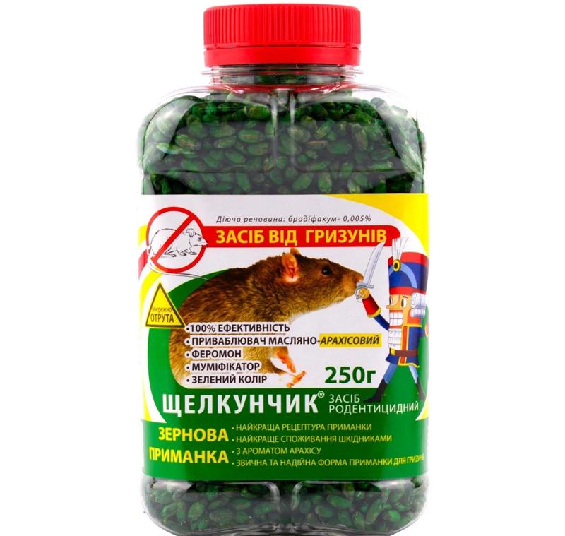 Различные виды полевых грызунов являются серьезной проблемой для производственных, промышленных, сельскохозяйственных, жилых и других видов помещений. Для того чтобы успешно бороться с мышевидными грызунами лучше всего подходит приманка Щелкунчик в зернах, изготавливаемая из зерен различных культур отравленных ядами. Она действует очень эффективно привлекая мышей в ловушку. Хороший эффект достигается благодаря запаху на который очень хорошо реагируют мыши. Приманка для мышей «Щелкунчик» отлично подходит для применения, как в помещениях, так и на открытом воздухе. Благодаря универсальности пользоваться ей очень удобно и экономически выгодно. После того как мышевидные грызуны поедят отравленные зерна они будут погибать в течении от 3 до 7 дней в зависимости от количества съеденных зерен и размеров грызуна. Для борьбы с мышами необходимо использовать порции от 20 до 50 грамм, крысами до 100 грамм. Размещать зерна нужно на картонных подложках или специальных емкостях. Такой способ борьбы очень эффективен и позволяет уничтожать целые семейства грызунов, проживающие на территории помещения или открытой местности. При использовании препарата нужно соблюдать правила безопасности раскладывая отравленные зерна с помощью пинцета и в перчатках, чтобы не допустить отравления.