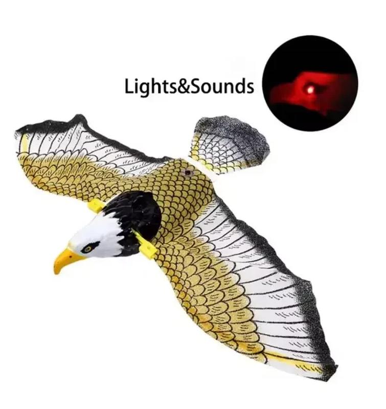 Отпугиватель птиц садовый орел пугало с подсеткой и звуком Садовый отпугиватель птиц в виде орла -- естественная защита ваших растений Надёжное и эстетичное решение для отпугивания птиц и сохранности урожая. Этот декоративный орёл, имитирующий хищного пернатого, помогает сократить активность мелких птиц, одновременно украшая пространство сада или участка. Дополнительные функции: • Подсветка глаз -- при включении глаза орла светятся, усиливая эффект присутствия • Имитированный звук -- устройство воспроизводит крик и щебет хищной птицы, пугая нежеланных гостей Преимущества: • Реалистичная имитация охотящегося орла -- вызывает у птиц инстинктивный страх • Подходит для установки в саду, на балконе, террасе, даче или ферме • Необычный и полезный подарок для садоводов и дачников • Лёгкий монтаж -- подвешивается за считанные секунды Характеристики: • Размер в разложенном виде: 42 × 24 × 12 см • Размер в сложенном виде: 24 × 12 см • Материал: пластик • Питание: 2 батарейки AA (в комплект не входят) Эффективная альтернатива химическим средствам: сочетает визуальный и звуковой отпугивающий эффект.