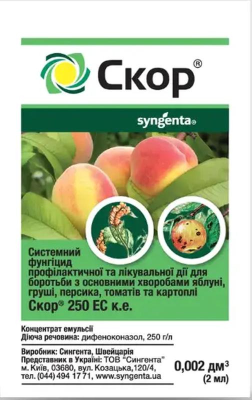 Фунгицид системного воздействия Скор 250 EC к.э (2 мл) Syngenta Швейцария Универсальный системный фунгицид, применяется для лечения и профилактики широкого спектра заболеваний культуры овощного и плодово-ягодного типа. Сенгента применяется для лечения груши, картофеля, персика, томатов, яблони от парши, мучнистой росы, альтернариоза, цыпленка листьев. Преимущества препарата: Фунгицид экономичен благодаря низким нормам расхода Препарат активно действует при повышенных температурах Средство быстро проникает в ткани растений (в течение 2 часов), устойчивое к смыванию обсадками после обработки. Препарат способствует увеличению плодоношения культуры, улучшает качество плодов. Фунгицид Скор эффективен против широкого комплекса грибковых заболеваний Этот фунгицид обладает хорошим стоп-эффектом благодаря системному действию. Инструкция, способ применения: Активное вещество: дифеньоназол 250 г/л Препарат высокоэффективен против мучнистой росы при умеренном поражении. В случае сильного поражения -- Скор надо смешивать с препаратом Топаз. обработку следует проводить препаратами других химических групп. Рекомендуемая норма расхода рабочего раствора: Фунгицид системного воздействия Скор 250 EC к.э (2 мл) Syngenta Швейцария Универсальный системный фунгицид, применяется для лечения и профилактики широкого спектра заболеваний культуры овощного и плодово-ягодного типа. Сенгента применяется для лечения груши, картофеля, персика, томатов, яблони от парши, мучнистой росы, альтернариоза, цыпленка листьев. Преимущества препарата: Фунгицид экономичен благодаря низким нормам расхода Препарат активно действует при повышенных температурах Средство быстро проникает в ткани растений (в течение 2 часов), устойчивое к смыванию обсадками после обработки. Препарат способствует увеличению плодоношения культуры, улучшает качество плодов. Фунгицид Скор эффективен против широкого комплекса грибковых заболеваний Этот фунгицид обладает хорошим стоп-эффектом благодаря системному действию. Инструкция, способ применения: Активное вещество: дифеньоназол 250 г/л Препарат высокоэффективен против мучнистой росы при умеренном поражении. В случае сильного поражения -- Скор надо смешивать с препаратом Топаз. обработку следует проводить препаратами других химических групп.