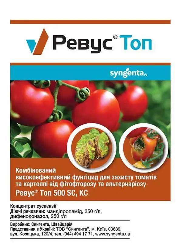 Комбинированный фунгицид Ревус топ 500 SC л.с. Syngenta Швейцария Эффективный системный фунгицид Ревус топ используется для лечения томатов и картофеля от фитофтороза, альтернариоза и других тяжелых заболеваний сельскохозяйственных растений. Препарат содержит действующие вещества: мандипропамид и дифеноконазол, благодаря которым средство быстро проникает в растение и обеспечивает надежную защиту верхней и нижней листовых поверхностей. Мандипропамид закрепляется на восковом налете листа, обеспечивая прочную защиту от фитофтороза, а также останавливает прорастание спор, угнетает образование гаусторий и рост мицелия. Дифеноконазол быстро распространяется на все растение, уничтожает возбудитель альтернариоза и останавливает рост мицелия. Эффективен при неблагоприятных погодных условиях и не проявляет фитотоксичности по отношению к возделываемым культурам, окружающей среде и человеку. Комбинация двух действующих веществ препарата существенно увеличивает его эффективность против фитофтороза и альтернариоза. Средство обладает высокой эффективностью при неблагоприятных погодных условиях, устойчиво к смывам осадками. Фунгицид обладает профилактическими и лечебными свойствами. Препарат не токсичен для возделываемых культур и для окружающей среды, не накапливается в корнях. Данный фунгицид совместим с другими препаратами и прилипачами Действующее вещество: мандипропамид 250 г/л, дифеноконазол 250 г/л. Культура и норма расхода препарата Ревус топ. Культура Болезни Норма расхода препарата Особенности применения Срок ожидания Картофель, Томаты Фитофтороз, альтернариоз 6 мл на 5 л воды на 1 сотку Первая профилактическая обработка или при проявлении первых признаков заболевания, Вторая и последующие обработки через 7-12 дней 14 дней Препарат Ревус Топ рекомендуется применять с профилактической целью или при первых симптомах болезни, с целью предотвращения развития болезни и заражения всего урожая. Рекомендуемая норма расхода рабочего раствора составляет 200-300 л/га. Для обработки винограда норма расхода составляет 2 л раствора на 1 сотку.