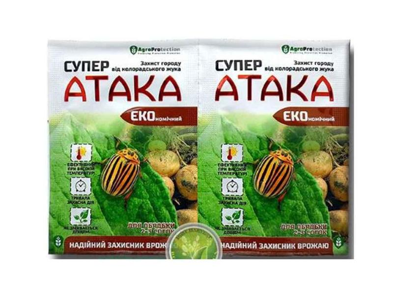 Форма препарата: Концентрат суспензии Состав действующего вещества: тиаклоприд-200 г / л кротианидин-100 г / л. Приготовление рабочего раствора: согласно таблице в указанном объёме воды растворить содержимое пакета Супер ATAKA - 4 мл, тщательно перемешать. Досить для обробки 2-3 соток. В средстве применяется действующие вещества последнего поколения, благодаря этому в препарате совмещен быстрый «нокдаун-эффект» 20 минут) и длительное защитное действие (до 28 дней). Способ применения: Культура Норма затрат вредителей Время обработки Картофель, Томаты, Плодовые деревья, паслин 4 мл на 10 л води на 2 сотки Колорадский жук, трипсы, совки, листовойки, клещи, щитовки, попелки, моли и другие. Опрыскивание в период вегетации при появлении вредителей Меры предосторожности: при работе с препаратом использовать средства индивидуальной защиты, не есть, не пить, не курить. Следует избегать вдыхания аэрозоля, попадания на кожу и в глаза. После работы с препаратом вымыть с мылом руки и лицо. Хранить в закрытой заводской упаковке в недоступном для детей месте, отдельно от пищевых продуктов и медикаментов при температуре от 0 до 35 С. Избегать попадания препарата в корм для животных, не допускать выпасания скота на обработанных территориях. Не глотать. Класс опасности - ІІ класс. Скорость действия признаков поражения вредителей проявляются через 20 минут после обработки, полная гибель наступает через 2-5 часов. Первая помощь: При попадании препарата на кожу или в глаза промыть их чистой водой. При попадании в желудок - очистить желудок, принять активированный уголь, обратиться к врачу. Гарантийный срок хранения: 5 лет. Обработка выполняются стандартными опрыскивателями. Рабочий раствор готовят непосредственно перед применением. Не рекомендуется выполнять обработку в условиях воздействия высоких температур воздуха, интенсивного солнечного излучения и сильного ветра. Срок последней обработки: 20 дней до сбора урожая. Максимальная кратность разделок по