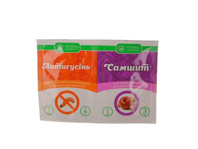 АНТИГУСІНЬІнсектицид контактно-кишкової дії для захисту овочевих, пасльонових, плодових та інших культур від комплексу шкідниківшвидко та ефективно діє на основних стадіях розвитку комах;проявляє довготривалу дію на шкідників;не розвиває резистентності (стійкості) у шкідників;сприяє збільшенню кількості та покращенню якості врожаю;економічно вигідний та екологічно безпечний.Діюча речовина: лямбда-цигалотрин, 50 г/л. Препаративна форма:концентрат суспензії. САМШИТСистемний фунгіцид від комплексу хвороб яблунь, персиків та виноградників.широкий спектр захисної дії; високоефективний проти багатьох збудників грибкових хвороб; стійкий до змивання атмосферними опадами; покращує якість продукції, збільшує кількість плодових формувань; значна економія коштів; зниження вірогідності виникнення резистентності у патогенів.Діюча речовина: Крезоксим-метил,100 г/л дифеноконазол, 200 г/лПрепаративна форма: концентрат суспензії.