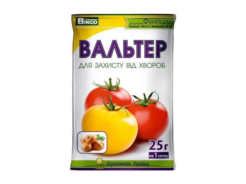 Вальтер - комбинированный фунгицид системного и контактного действия для защиты овощных (томаты), технических (картофля) культур от комплекса болезней: фитофтороз, альтернариоз, перено-нароз. Металаксил, содержащийся в составе препарата, быстро поглощается и распространяется внутри растения, подавляет распространение болезни и защищает молодой прирост от поражения, а манкоцеб создает на поверхности растения защитную пленку, препятствующую проникновению спор и прорастанию новых лодочек гриба. Купить Вальтер от фитофтороза для томатов и картофеля можно в нашем интернет-магазине Гарден Клаб с бесплатной доставкой и по лучшей цене. Культура Болезни Нормы затрат Картофель, томаты Фитофтороз, альтернариоз, перононароз 25 г на 5 л воды на 1 сотку 50 г на 10 л води на 2 сотки 250 г на 50 л води на 10 соток Рекомендации по применению Вальтер для картофеля и томатов: Обработка растений проводить до начала распространения заболевания с целью повышения защитного действия препарата. Рабочий раствор готовить непосредственно перед обработкой и равномерно опрыскивать им растения. Бак опрыскивателя заполнить водой 1/3 объема, растворить препарат согласно норм, добавить оставшуюся воду, перемешать. Опрыскивание проводить с утра или вечером, при отсутствии порывчатого ветра (скорость не более 5м/с), температуре воздуха от 12°C, до 25°C. Не проводить опрыскивания меньше чем за 2 часа до осадков. Период обработок I обработка – до появления симптомов болезни, в период активного роста растений и приблагоприятных для распространения болезни погодных условиях. II-II отделка – через 7-10 дней для томатов, 10-14 дней для картофеля. Срок последней обработки до сбора урожая – 14 дней. Строки выхода на обработанные площади для ручных работ (деб) – 7.