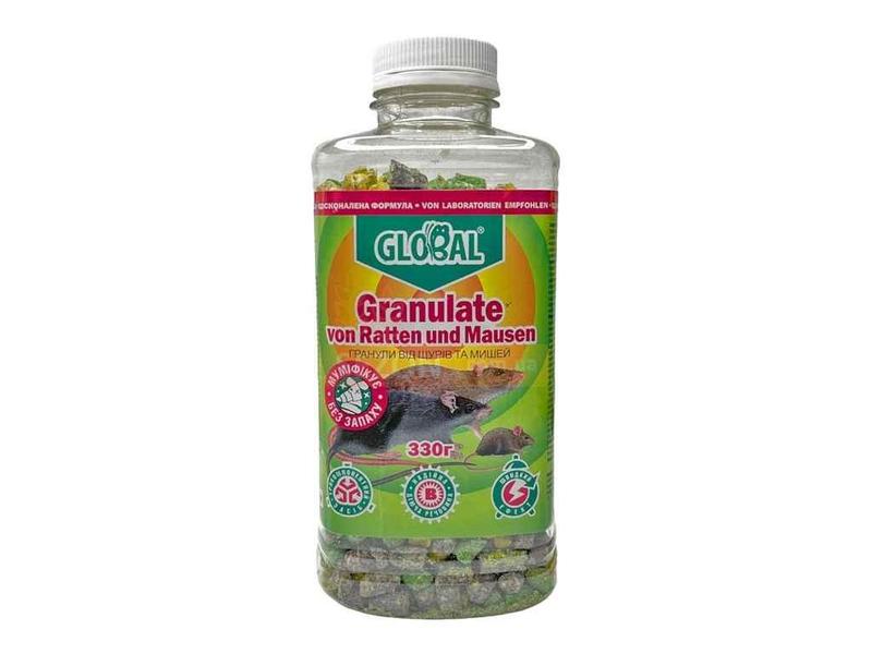 Гранулированная приманка Global применяется для защиты жилых, производственных, подсобных и складских помещений, хранилищ, дачных и приусадебных участков, амбаров, погребов, подвалов, с целью уничтожения крыс, мышей, политок и других мышечных грызунов. Данное средство содержит в составе действующее вещество - бродифакум, - родентицид кишечного действия, являющийся синтетическим антикоагулянтом крови, который нарушает процесс образования белков протромбинового комплекса. Через сутки после употребления летальной дозы препарата резко снижается уровень свертываемости крови, что в дальнейшем приводит к внутреннему кровотечению и гибели вредителя. Гибель грызунов наступает в течение 3-5 суток после поедания смеси преимущественно на открытом воздухе. Ароматизированные пищевые добавки в составе препарата Глобал активно заманивают грызунов и являются привлекательными для поедания. Также в состав данного препарата включен специальный компонент Битрекс, который имеет горький вкус, чтобы избежать случайного поедания родертицида домашними животными. Преимущества препарата Глобал для борьбы с грызунами Глобал Гранулированная приманка готова к применению и не требует дальнейшего приготовления Натуральные пищевые компоненты родентицида Глобал эффективно привлекают грызунов Гранулы не имеют запаха и не выделяют вредных испарения Препарат global содержит специальный горький компонент Битрекс, который защищает животных от случайного поедания приманки Протравленные гранулы обладают высокой токсичностью и гарантируют 100%-ную гибель грызунов Инструкция, способ применения, состав, дозировка и норма расхода родентицида от крыс и мышей Global 330 г Глобал Действующее вещество: бродифакум 0.005 %, функциональные добавки, краситель, вода, аттрактант, битрекс. Экструзионные гранулы Глобул размещают в местах появления и перемещения грызунов: возле нир, ходов, в местах обнаружения следов жизнедеятельности грызунов (последова). Гранулы насыпаются на картонные или пластиковые подкладки, или в специальные полимерные контейнеры по 30-40 г. Не прикасайтесь руками препар