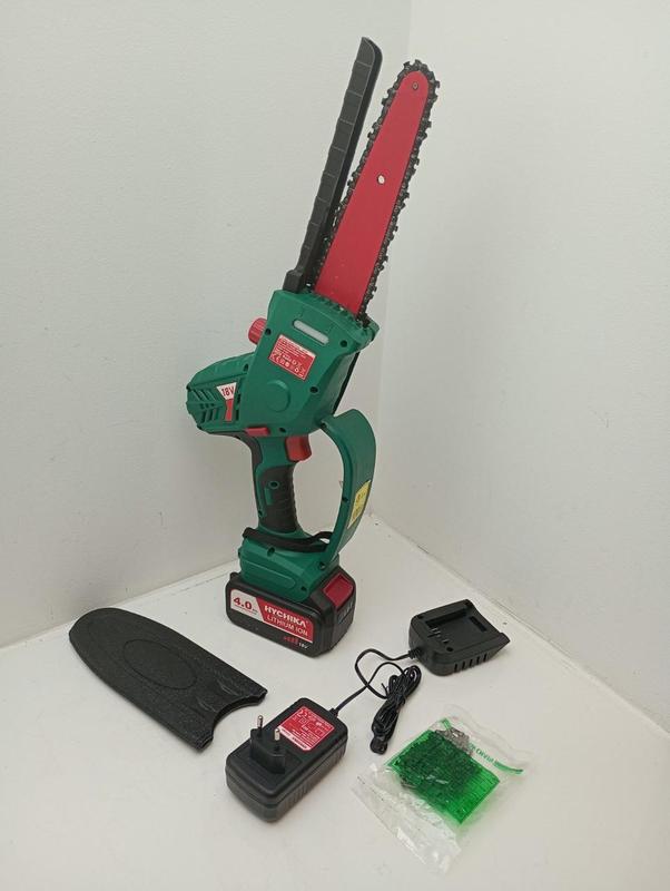 8-дюймовий ланцюг зі швидкістю різання до 7,5м/с. З повним захистом над ланцюгом. Супутнє налаштування запобіжника запобігає випадковому запуску. Ергономічна, з низьким рівнем вібрації та без втоми для тривалої роботи однією рукою. Живиться від акумулятора 18 В В комплекті акумулятор, зарядна станція, ланцюг та захист. Стан вживаний, Б/в