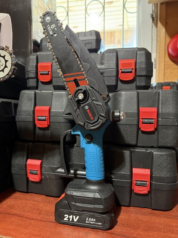 В наборі: - Електропила - ланцюг 2 шт - акумулятори 2 шт - зарядний пристрій - олія - захисні окуляри - рукавиці - кейс для зберігання інструментів