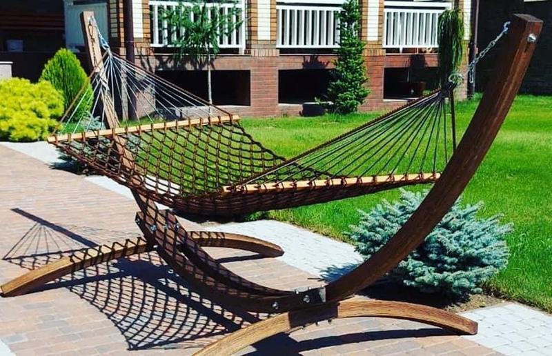 Власне виробницвто!!! Дерев'яний тримач для гамака виготовлений із склеєного соснового брусу, із застосуванням водовідштовхуючих, нетоксичних матеріалів, та високої якості та міцності монтажно-підвісних деталей. Стійкий до дії сонячного проміння, а також до атмосферних умов. Допустиме навантаження до 250 кг. Гамак підвісний виготовлений за оригінальним ручним методом плетіння, з якісніх міцних та надійних матеріалів: -Канат з поліпропіленовим серцевиною та шовковою оболонкою товщиною 10 мм . Характеризуються мінімальним водопоглинанням, стійкістю до сонячного проміння та атмосферних умов, а також довго зберігає свої властивіості. Достатня еластичність даного канату забезпечує комфортабельні довготривале зручне перебування на гамаку. Не токсичний, гіпоалергенний . Розривне навантаження від 250 -300кг Температура плавлення 140 С. -Дерев'яна яна опорна планка виготовлена з твердої породи дерева (Ясен) та перевірена на міцність та наявність дефектів в процесі виготовлення. Дана планка оброблена захистними матеріалами які забазпечують довготривале та надійне використання . -Капроновий шнур застосовується для з'єднання єднання основного канату. Не велика еластичність та висока міцність запобігає виникненню деформації, розтягнення та провисання гамака. - Сталеві монтажні кільця та карабін високого класу міцності. ЦІНА З ПДВ!!